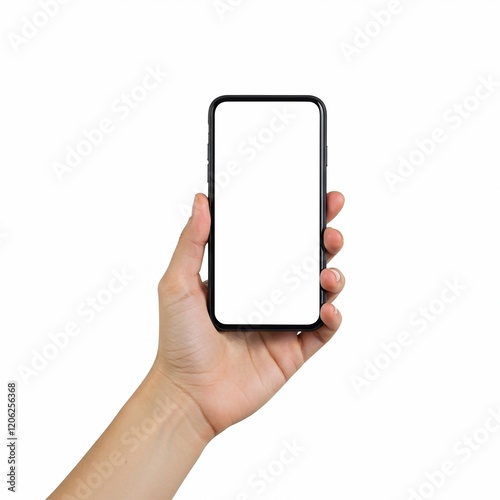 Woman hand holding phone on white background with copy space. Woman holding smartphone with white screen. Hand with blank cellphone display, close-up