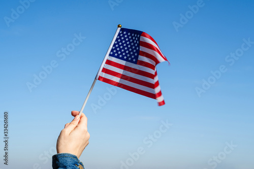 Woman hand with American swaying flag on the blue sky. America. USA. Concept