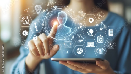 Woman hands and finger touch AI bot, creative services icons. Copy space