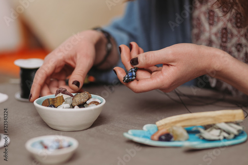 Woman hands making handmade gemstone jewelry, home workshop. Woman artisan creates jewelry. Art, hobby, handcraft concept