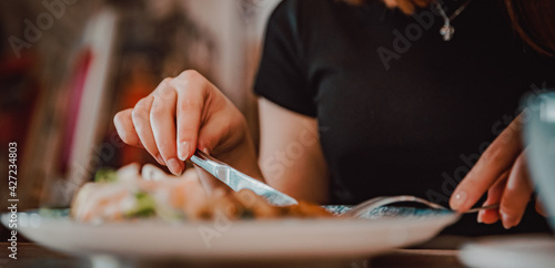 woman, food, table, hand, knife, fork, cut, chop, cafes, background, beef, beefsteak, closeup, cooked, cookery, dinner, eat, female hand, filet, fillet, fried, girl, grilled, hold, juicy, lunch, meal, meat, medallion, medium, plate, pork meat, potato, rare, red, eatery, roast, roasted, sauce, served, sirloin, sitting, slice, steak, vegetable, wooden