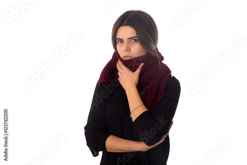 adult, clothing, casual attire, people, 1, black, colours, hair, female, portrait, person, looking, beautiful, blouse, shoulder, slim, posing, front, white, head, studio, young, serious, face, woman, real, background, staring, human, shirt, attractive, caucasian, standing, femininity, vinous, foulard