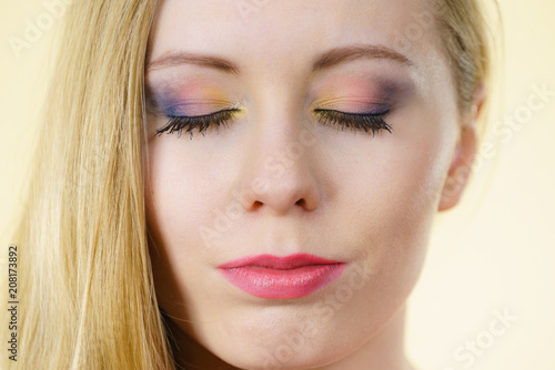 woman, face, constructed, up, colourful, visage, beauty, closeup, portrait, yellow, background, lipstick, eyeshadow, eye, closed