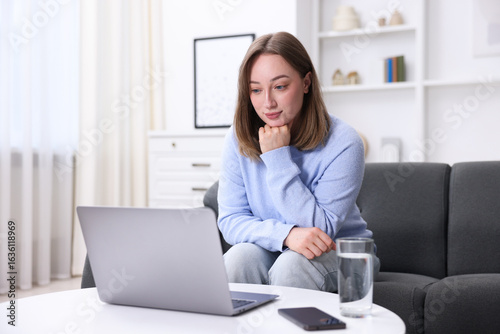 Woman having online consultation with doctor via laptop at home