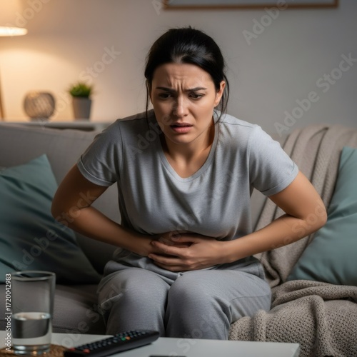 Woman having stomach ache at home. Adult caucasian female suffering from painful abdominal cramp. Health issue and medical condition.