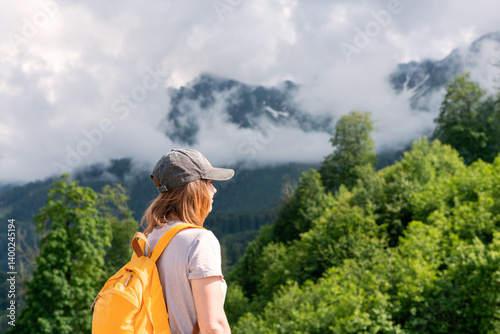 Woman hiker with yellow backpack and cap looks at a foggy mountain landscape surrounded by lush greenery, adventure and tranquility in nature setting, hiking and active healthy lifestyle , copy space