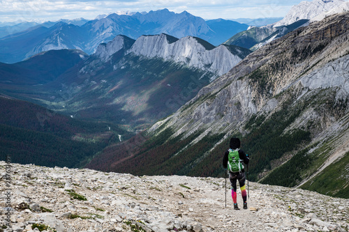 Woman hiking a trail of the Canadian Rockies in Jasper National Park, Alberta, Canada