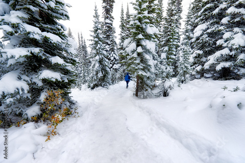Woman hiking in a Pine Trees with Snow On A Mountain In Winter