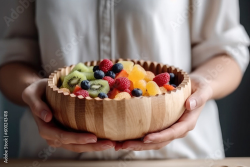 Woman holding a bowl full of fresh oranges, kiwis and red berries. Generative AI.