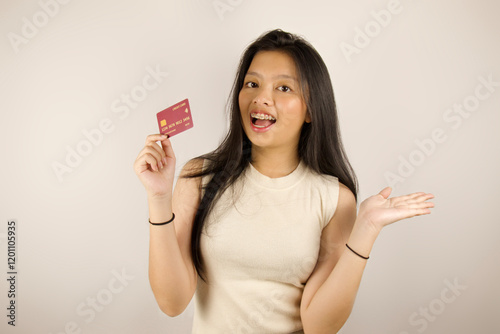 woman, gift, beauty, people, smiling, person, holding, present, card, smile, christmas, box, lady, 1, hand, fun, business, hair, happiness, red, studio, face