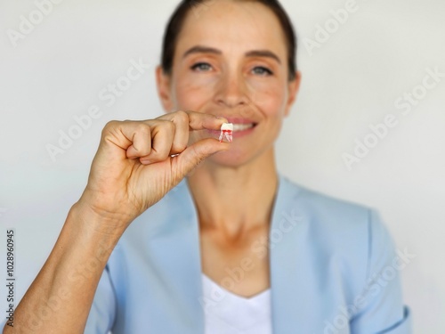woman, holding, teeth, model, smiling, demonstrating, oral, health, awareness, extraction, dental, hygiene, dentistry, health care, indoor, teeth, mouth, care, presentation, education, neutral, background, gum, smile, preventive, feminine, communication, lifestyle, orthodontic, campaign, facial, expression, gesture, confidence, positive, message, wellness, preventative, proactive, practice, beauty, appearance, modern, promotion, clean, patient, informative, advice, clinic