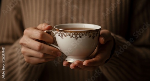 tea, holding, cup, steaming, hand, woman, beverage, drink, ceramic, elegant, ornate, vintage, warm, cosy, indoor, closeup, traditional, lifestyle, relaxation, comfort, sweater, beige, brown, hot, vapour, steam, gold, pattern, luxury, afternoon, afternoon tea, break, calm, quiet, still life, health, wellness, hospitality, home