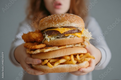 burger, fries, chicken, food, woman, hand, bun, cheese, lettuce, beef, meal, fast food, unhealthy, sandwich, stack, fried, snack, calorie, fat, carbohydrate, sesame, bread, person, holding, offering, lunch, dinner, eating, diet, obesity, cholesterol, indulgence, temptation, craving, nourishment, eatery, take-away, delivery, closeup, studio, indoor, lifestyle, casual attire, simple, plain, neutral
