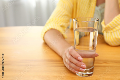 Woman holding glass of water at wooden table, closeup with space for text. Refreshing drink