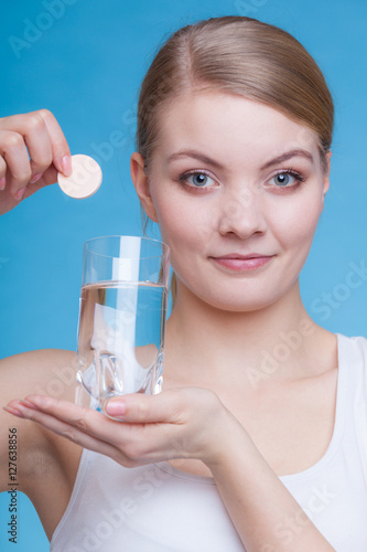Woman holding glass with water and effervescent tablet
