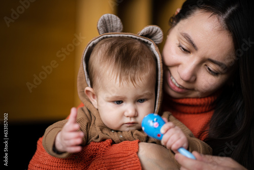 Woman holding little five, six months baby smiling at home.Mother and child indoors.Happy parent playing with child.