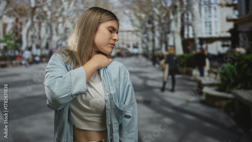 woman, neck, holding, street, blond, young, city, outdoors, female, urban, discomfort, pain, ache, soreness, filtered, tension, distress, misery, agony, grasping, clutching, pavement, bench, pedestrian, tree, building, metropolitan, downtown, outside, youthful, fair-haired, alone, avenue, boulevard, road, lady, person, city landscape, solo, portrait, expression, human, adult, candid, gesture, health, injury, wellness