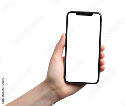 Woman holding smartphone with blank screen on white background, closeup. Mockup for design