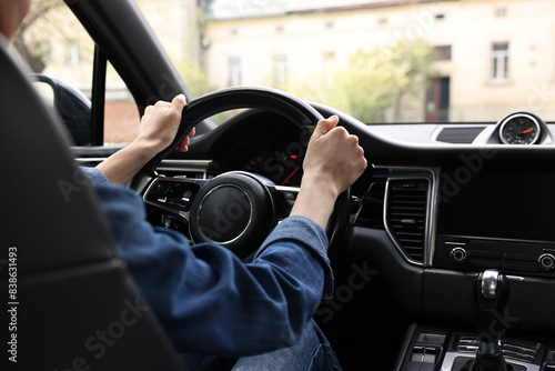Woman holding steering wheel while driving her car, closeup