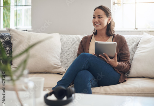Woman, home and sofa with thinking on tablet for social media post and entertainment in living room. Female person, internet and streaming service or website for news update or online search
