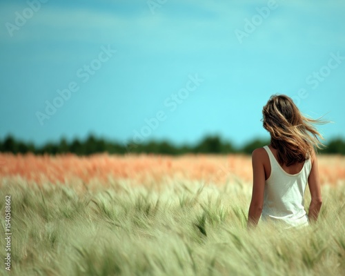 woman, field, sky, wind, wheat, nature, calm, freedom, movement, light, serenity, beautiful, huge, tan, blond, back, thinking
