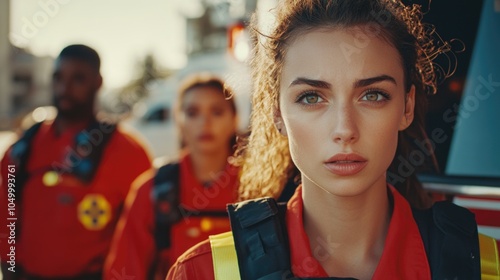 Woman in a red shirt with a yellow stripe on it stands in front of two other people