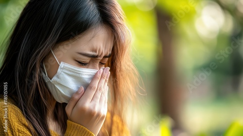 woman, face, mask, pollution, coughing, park, smoke, air, dust, safety, unhealthy, allergy, city, environment, protection, particle, respiratory, health, hazard, contamination, pollutant, smog, fog, breathing, urban, toxic, exposure, clean air, filter, virus, climate change, lung, nature, closeup, outside, nose, flu, sick, blowing, sneeze, blow