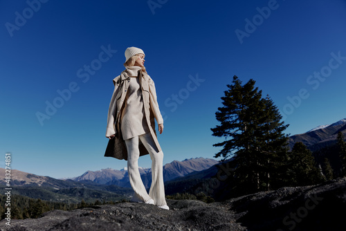 woman in autumn clothes stands on a rock landscape blue sky landscape