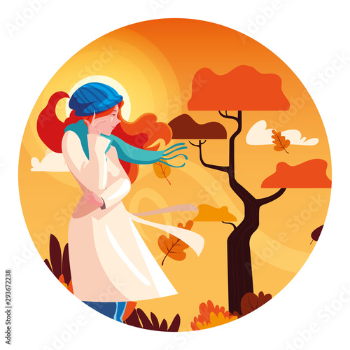 woman, girl, avatar, autumn, hat, red, hair, tree, sun, cloud, leaf, vector, season, nature, ornament, garden, decoration, botany, natural, beauty, flora, fresh, beautiful, decorative, life, environment, climate, lush, detail, gardening