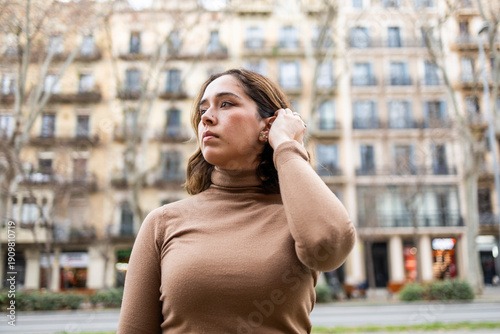 woman, sweater, beige, turtleneck, hair, adjusting, urban, building, city, balcony, window, architecture, street, fashion, style, modern, casual attire, day, lifestyle, portrait, expression, confident, sharpened, person, female, outfit, scenery, exterior, residential, design, apartment, downtown, spring, nature, tree, daylight, scene, real, urban setting, young adult, public, background, latin, hispanic