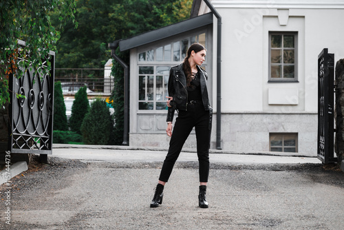 woman, leather, jacket, black, boot, urban, confident, modern, edgy, fashion, style, chic, strong, outfit, casual attire, street, bold, young, powerful, girl, cool, sleek, contemporary, attitude, elegance, tough, independent, minimalist, stylish, trendy, footwear, youthful, metropolitan, sophisticated, aesthetic, city, person, female, lifestyle, model, portrait, caucasian, sad, serious, brunette, posing, professional, leather jacket, clothes