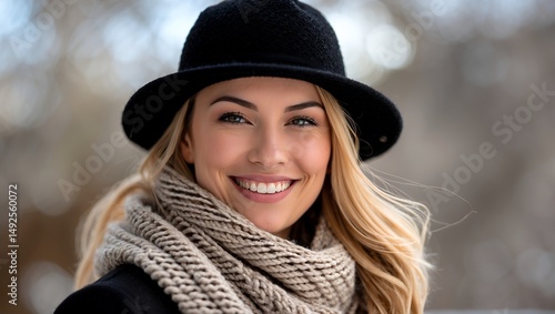 woman, black hat, foulard, smiling, camera, warm, cosy, happiness, joy, fashion, style, portrait, cheerful, seasonal, lifestyle, comfort, nature, cold weather, candid, friendly, expression, beauty, calmness, snow, relaxed, content, vibrant, atmosphere, scene, casual clothes, accessory, smile, leisure, personality, daylight, closeup, festive, joyful, charming, serene, winter fashion
