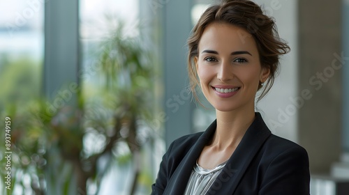 Woman in Business Attire: A confident woman in professional business attire, smiling against a modern office backdrop.