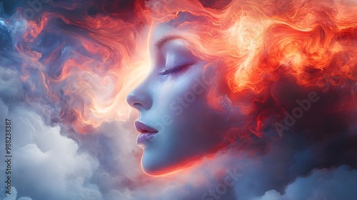 mystical, spirit, visual, dreamy, surreal, creation, facial, movement, atmosphere, figure, dream, vibrant, creativity, emotion, paint, artistic, expression, freedom, shade, aesthetic, allure, whimsical, ambience, depth, illustration, portrait, woman, art, abstract, cloud, concept, design, sideview, detail, beauty, colours, nature, landscape, enchant