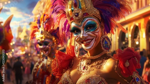 carnival, mask, costume, parade, festival, celebration, woman, feather, colourful, bright, red, orange, purple, blue, green, gold, glistering, happy, smiling, vibrant, street, crowd, event, culture, tradition, entertainment, performance, art, design, fashion, jewellery, constructed, up, headwear, show, spectacle, exotic, tropical, party, holiday, celebratory, joyful, passionate, energy, dynamic, gorgeous, amazing