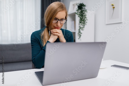 laptop, woman, working, earphones, connection, desk, typing, hot drink, workspace, person, wireless, using, online, businesswoman, blond, eyeglass, cyberspace, freelancer, computer, female, home, technology, caucasian, modern, lifestyle