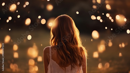 Woman in festive outdoor event, surrounded by twinkling lights, immersed in celebratory ambiance