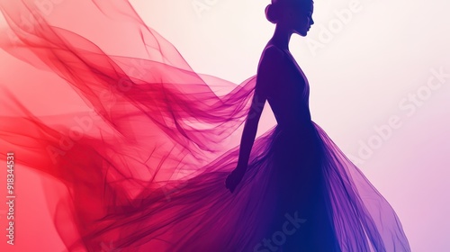 woman, silhouette, gown, dress, flowing, fabric, pink, purple, gradient, background, aethereal, elegant, graceful, delicate, fashion, beauty, femininity, art, abstract, dreamy, soft, light, airy, romantic, love, hope, inspiration, studio shot