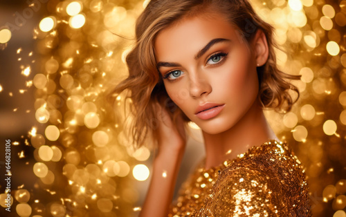 Woman in gold on golden sparkling background, luxury dress and jewels