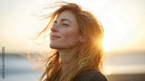 Woman in Head - and - Shoulders Portrait Enjoying Fresh Air on the Beach under Soft Natural Light with Blurred Ocean Background