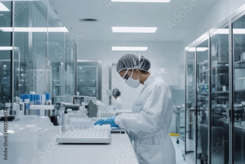 woman, laboratory, coat, computer, scientist, office, work, occupation, profession, research, study, technology, innovation, digital, screen, typing, keyboard, mouse, workspace, modern, contemporary, indoor