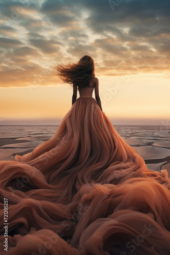 Woman in long evening dress in the desert