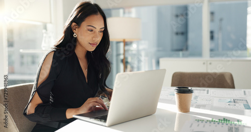 Woman in office with laptop, market research and notes for social media review, business feedback or planning. Thinking, search and businesswoman networking online for startup, website and report.