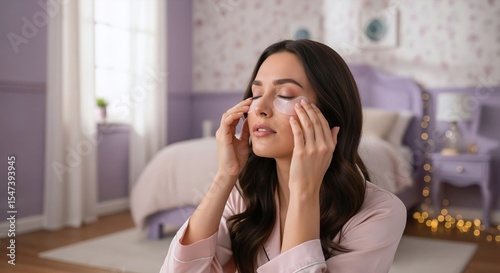 Woman in pajamas applying eye patches in a beautiful purple bedroom. Morning beauty routine for skin care. self care and anti aging spa treatment at home