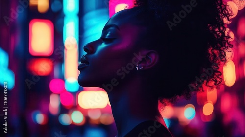 woman, profile, neon light, city street, night, urban life, vibrant, energy, nightlife, atmosphere, modern