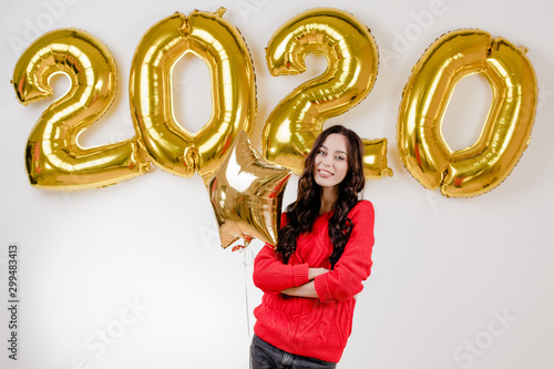 woman in red sweater holding golden star balloon in front of 2020 new year balloons