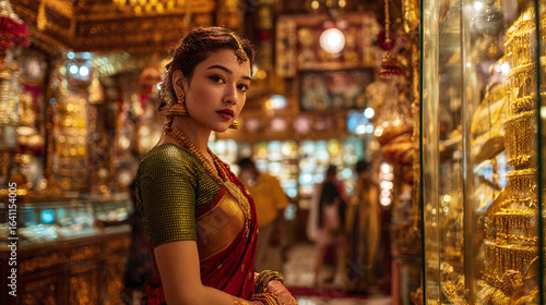 Woman in sari admires jewelry in shop. Gold adornments sparkle in glass cases, reflecting in her eyes. A moment of opulence and beauty.