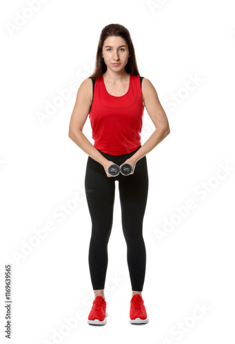 Woman in sportswear exercising with dumbbells on white background