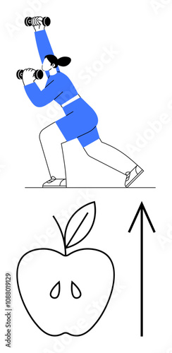 Woman in sportswear lifting dumbbells, apple with leaf, and upward arrow indicating progress. Ideal for health, fitness, nutrition, wellness, motivation personal growth and lifestyle concepts. Line