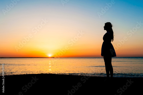 Woman in summer dress standing on a sandy beach and looking to the sun